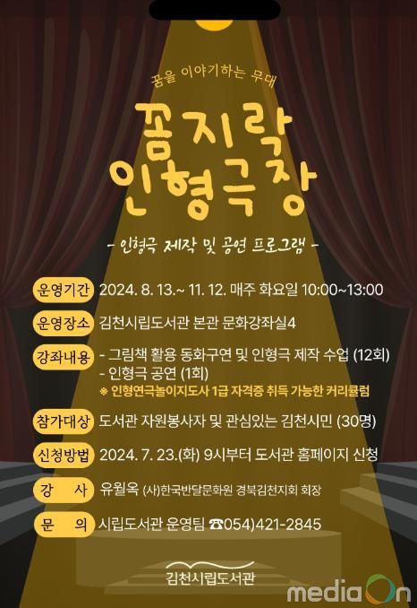 영남연합포커스 기자 | 김천시립도서관은 오는 8월 13일부터 11월 12일까지 3개월에 걸쳐 도서관 자원봉사자와 인형극에 관심 있는 시민을 대상으로 인형극 제작 프로그램 '꼼지락 인형 극장'을 운영한다.