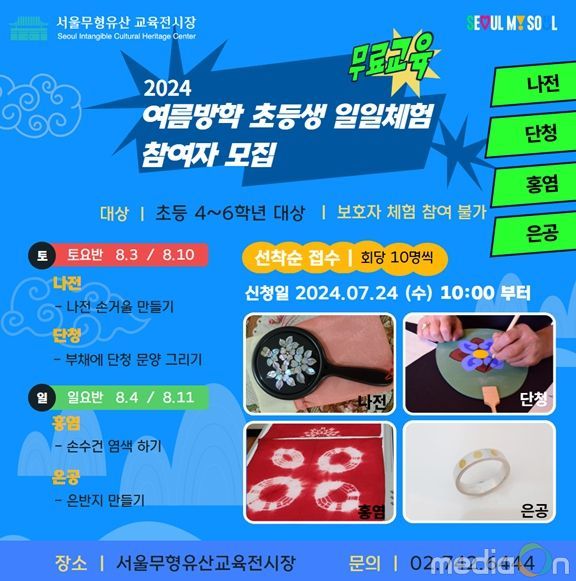 참여를 원하는 학생들은 7월 24일부터 서울무형유산교육전시장 누리집에서 선착순 무료 접수 하면 된다.