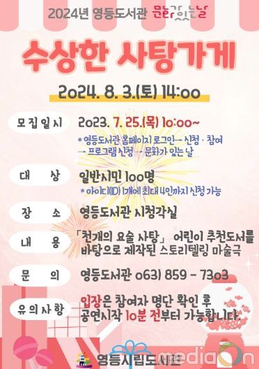 영남연합포커스 기자 | 익산시 영등시립도서관이 여름방학을 맞아 '문화가 있는 날' 행사로 오는 8월 3일 시청각실에서 어린이 마술극 '수상한 사탕가게'를 선보인다.