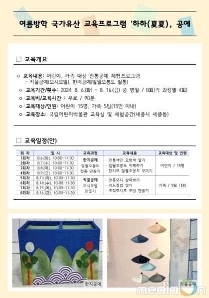 영남연합포커스 기자 | 국가유산청 한국전통문화대학교 전통문화교육원은 8월 6일부터 8월 16일까지 총 8회(2개 과정을 각 4회씩 운영)에 걸쳐 국립어린이박물관(세종시)에서 2024년 여름방학 국가유산 교육프로그램 '하하(夏夏), 공예'를 개최한다.