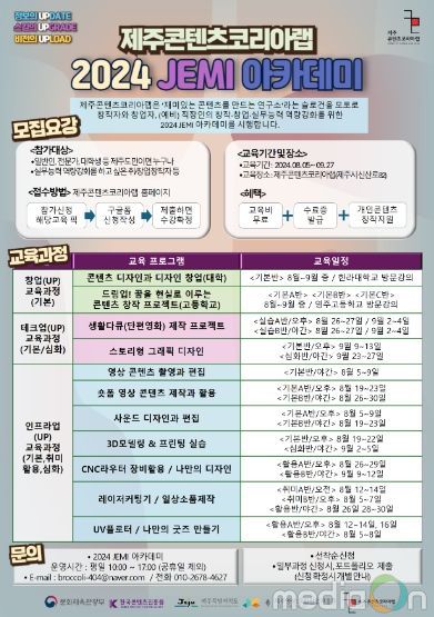 영남연합포커스 기자 | 제주특별자치도와 (재)제주영상·문화산업진흥원은 문화체육관광부, 한국콘텐츠진흥원의 ‘콘텐츠코리아랩 운영사업’의 일환으로 제주콘텐츠코리아랩 기반, 도내 콘텐츠 창작․창업 생태계를 활성화하기 위해 'JEMI아카데미'교육프로그램을 추진한다고 밝혔다.
