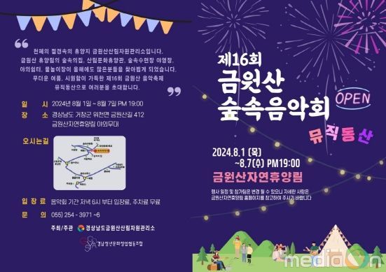 영남연합포커스 기자 | 금원산산림자원관리소는 오는 8월 1일부터 7일까지 7일간 자연휴양림 내 야외무대에서 제16회 금원산 숲속음악회를 개최한다고 밝혔다.