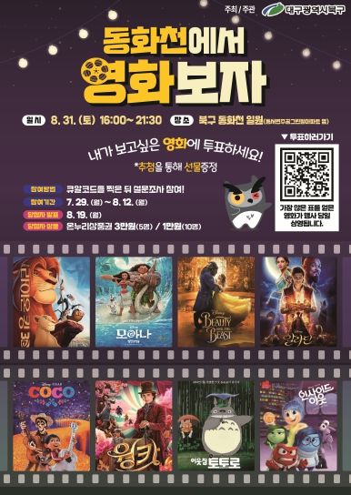 이번 행사에 앞서 진행하는 사전이벤트가 눈여겨 볼 만하다. 7월 29일부터 8월 12일까지 북구청 홈페이지, 공식 SNS를 통해 공개되는 영화 리스트를 확인하고 내가 보고 싶은 영화에 투표하면 추첨을 통해 상품이 쏟아진다.