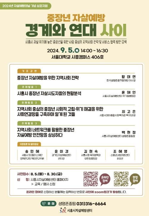 이번 행사는 시흥시 중장년층의 자살 예방을 위한 지역사회 전략 및 서비스 협력 방안을 모색하고자 기조 강연과 주제 발표, 종합토론으로 구성된 심포지엄 형태로 진행된다.