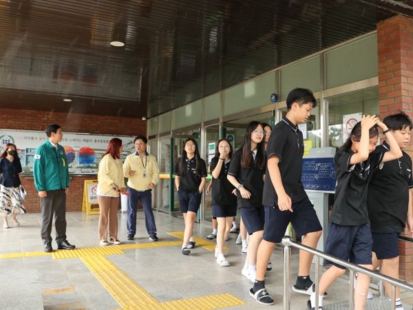 영남연합포커스 김진우 기자 | 충주시는 22일, 충주 중앙중학교에서 학생과 교직원 등 400여 명이 참여한 공습 대비 민방위 대피훈련을 실시했다.