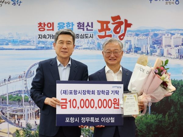 영남연합포커스 김진우 기자 | 이상철 포항시 정무특보가 퇴임을 앞두고 22일 인재 육성 장학금 1,000만 원을 포항시 장학회에 기탁하며 지역사회에 훈훈한 미담이 되고 있다.