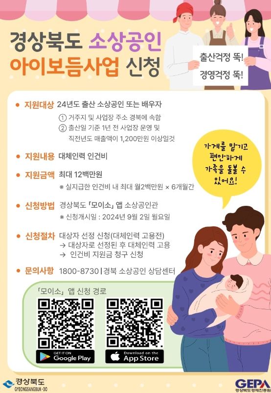 칠곡군(군수 김재욱)은 소상공인의 출산과 육아에 대한 경제적 부담을 덜어주기 위해 대체 인력 인건비를 6개월간 1천200만원까지 지원한다.