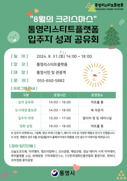 이번 성과 공유회의 부제는 ‘8월의 크리스마스’로 입주단체 11개 팀과의 협업을 통해 다양한 입주자 마켓(체험), 전시, 영화 상영, 포토존 등으로 구성해 통영시민이 참여할 수 있도록 준비했다.