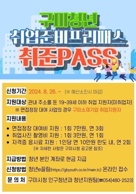 영남연합포커스 김진우 기자 | 구미시는 청년 취업의 필수 요소인 면접정장, 증명사진, 자격증 지원을 통해 지역 청년의 취업 준비 비용을 낮추고, 적극적인 구인활동의 기회를 제공하고자 2024 '구미청년 취업준비 프리패스(취준PASS)'사업을 확대하여 추진한다.