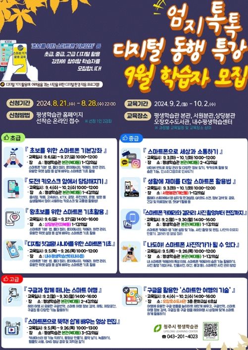 교육기간은 9월 2일부터 10월 2일까지 과정별 4회씩 진행되며, 수강료는 무료다. 디지털 교육을 배우고자 하는 청주시민이면 누구나 신청 가능하다.