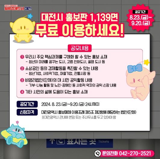 영남연합포커스 김진우 기자 | 대전시는 8월 23일부터 9월 20일까지 시 보유 홍보 매체를 무료로 이용할 업체를 공개 모집한다.