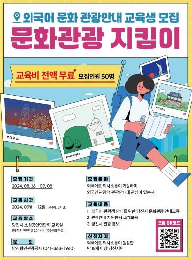 문화관광지킴이 교육은 9월 25일부터 12월 11일까지 3개월간 진행되며 외국어 관광안내 자원봉사자의 자질함양을 중심으로 진행된다. 교육내용은 당진시 관내 문화관광자원에 관한 지식습득 및 자원봉사소양교육 등으로 이루어지며 주 1회 3시간씩 진행될 예정이다.