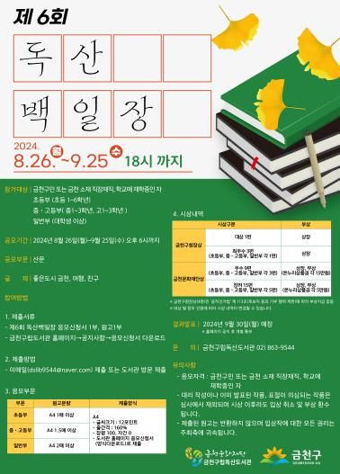 참여를 희망하는 구민은 글을 작성해 9월 25일 오후 6시까지 전자우편 또는 금천구립독산도서관 1층 종합자료실에 제출하면 된다. 제출양식은 금천구립도서관 누리집에서 내려받을 수 있다.
