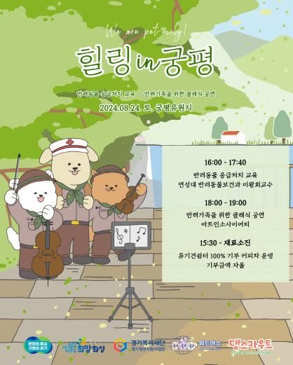 건강한 반려 문화를 확산과 반려동물 복지의 중요성을 알리기 위해 마련된 이번 행사는 경기도민이면 누구나 참여할 수 있다. 행사 프로그램으로는 연성대 반려동물보건과에서 진행하는 반려동물 응급처치와 실습, 아트인소사이어티 팀의 클래식 공연이 펼쳐질 예정이다. 참가자는 돗자리, 선풍기 등 더위를 피할 수 있는 준비물을 챙겨오는 것이 좋다.