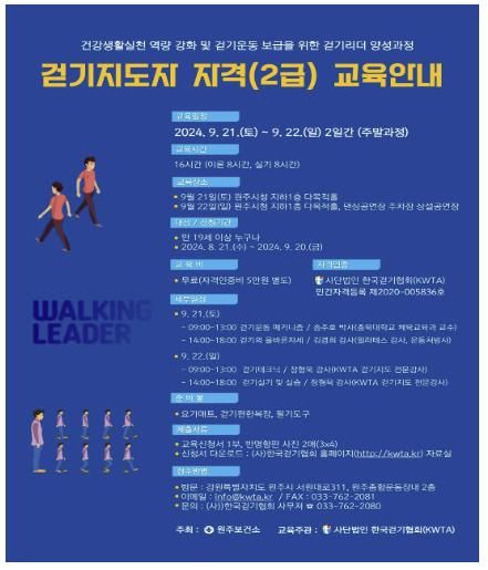 영남연합포커스 김진우 기자 | 원주시보건소는 시민들의 올바른 걷기 문화 촉진을 위해 9월 20일까지 하반기 걷기지도자 2급 과정 수강생 50명을 선착순 모집한다.