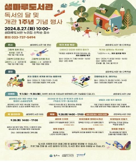 영남연합포커스 김진우 기자 | 원주시 샘마루도서관은 오는 9월 독서의 달과 개관 1주년을 기념하여 강연·전시·공연·이벤트·체험·북 플리마켓으로 구성된 다양한 문화 행사를 개최한다.