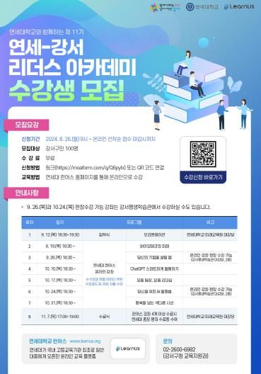 서울 강서구가 오는 26일부터 ‘제11기 연세-강서 리더스 아카데미’ 수강생 100명을 선착순으로 모집한다고 밝혔다.
