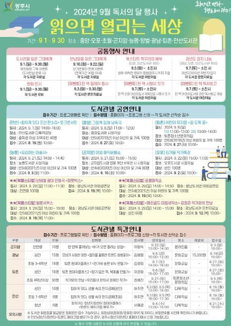 영남연합포커스 김진우 기자 | 광주시는 9월 독서의 달을 맞이해 독서의 중요성을 알리고 시민들이 책과 친숙해질 수 있도록 다양한 프로그램과 행사를 운영한다고 23일 밝혔다.