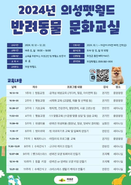 한편 2024년 반려동물 문화교실과 관련한 궁금한 사항은 의성 펫월드로 문의하면 안내받을 수 있다.
