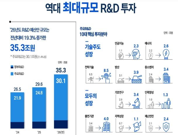 ’26년도 정부 연구개발 예산은 국민주권 정부의 첫 번째 연구개발 예산안이다. 체질 개선과 혁신을 기반으로 ‘진짜 성장’을 실현하고자 하는 정부 의지를 담아 역대 최대 규모인 35.3조 원 규모로 마련됐다. 이 중 자문회의에서 심의하는 주요 연구개발은 30.1조 원 규모이다. 이번에 심의·의결된 주요 연구개발 예산 배분·조정안은 정부 예산안 편성 과정을 거쳐 일반 연구개발과 함께 국회에 제출될 예정이다.