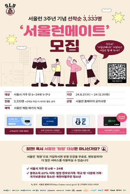 서울시는 ‘서울런’ 출범 3주년을 맞아 8월 21일부터 서울런 서비스를 체험할 수 있는 특별 프로그램 ‘서울런메이트’를 선착순 모집한다고 밝혔다. 만 6세~24세 시민이면 누구나 신청 가능하다.