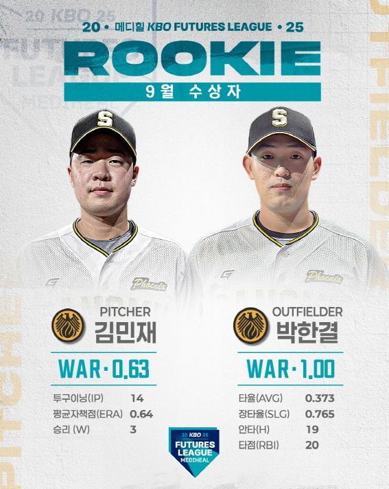 상무 김민재는 9월 한 달간 퓨처스리그 3경기(2경기 선발) 등판하여 총 14이닝을 소화하며 평균자책점 0.64(남부 1위)를 기록하고 3승(남부 1위)을 거두었다. 압도적인 제구력과 안정적인 경기 운영으로 팀의 상승세를 이끌며 올 시즌 마지막 루키상의 주인공이 됐다.
