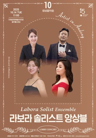 영남연합포커스 김진우 기자 | 안동문화예술의전당은 지역예술인들에게 다양한 무대 경험을 제공하고, 시민에게는 일상 속 음악 향유의 기회를 선사하기 위해 매월 첫째 주 화요일 오전 11시 로비음악회 시리즈를 진행하고 있다. 오는 10월 14일 오전 11시, '라보라 솔리스트 앙상블'이 안동문화예술의전당 웅부홀 로비에서 열린다.