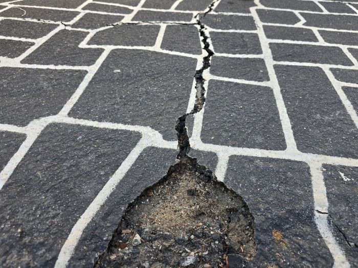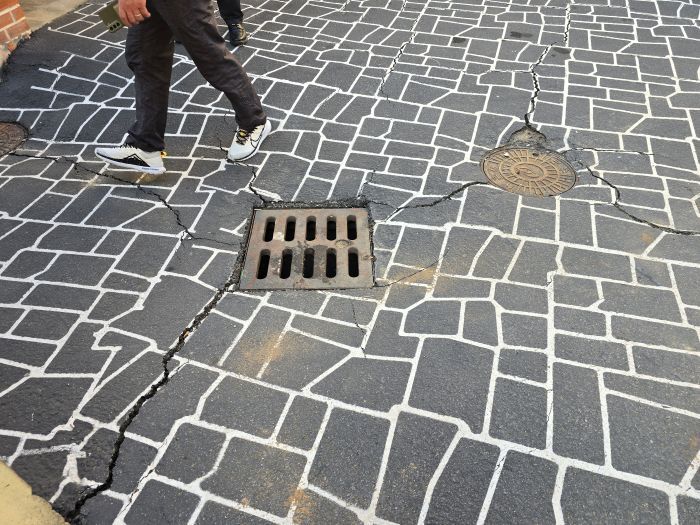 본지가 확보한 현장 사진에는 도로·보행로 전면에 걸쳐 거미줄처럼 퍼진 균열, 손가락이 깊게 들어갈 정도로 벌어진 틈, 배수로·맨홀 주변의 명백한 침하 흔적 등이 고스란히 드러난다. 배수구 주변 포장재는 들뜬 채 떨어져 나가고, 일부 구간은 아예 기층이 노출된 상태여서 시공 품질이 최소 기준조차 충족하지 못했다는 비판이 강하게 제기되고 있다.