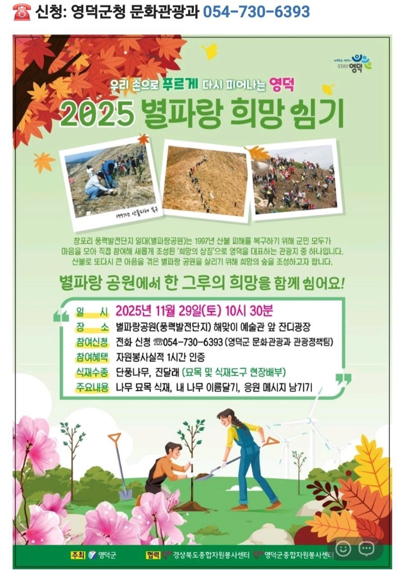 군 관계자는 “별파랑공원은 영덕이 자연 재해를 극복하며 공동체의 힘으로 되살린 공간”이라며 “이번 희망심기 행사는 미래 세대가 누릴 숲을 함께 만드는 의미 있는 시간”이라고 강조했다. 이어 “작은 호미질 하나가 영덕의 내일을 바꾸는 시작”이라며 적극적인 참여를 당부했다.