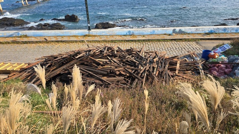 그러나 공사 현장을 직접 확인한 결과, 공사 폐목재·철 구조물·부식된 금속편·스티로폼 잔해·및 공사용 폐포대 등 다량의 폐기물이 해안 인근에 그대로 쌓여 있었다. 현장 옆에는 ‘폐기물 임시야적장’이라는 안내판이 세워져 있었지만, 폐기물 보관 기준, 침출수 방지 시설, 방풍막, 집하 공간 등의 조치가 전무한 상태다.