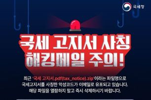 최근 '국세 고지서.pdf(tax_notice).zip'이라는 파일명으로 국세고지서를 사칭한 악성코드가 이메일로 유포되고 있습니다. 해당 파일을 열람하지 말고 즉시 삭제하시기 바랍니다.
