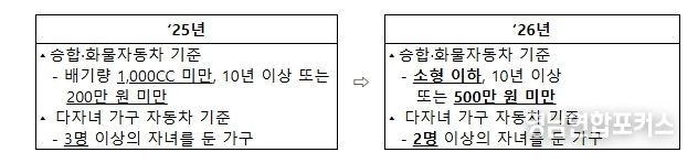 2026년부터는 소형 이하이면서 10년 이상 또는 500만 원 미만인 승합·화물차도 일반재산 환산율이 적용되고, 2명 이상의 자녀가 있으면 다자녀 가구로 인정된다.