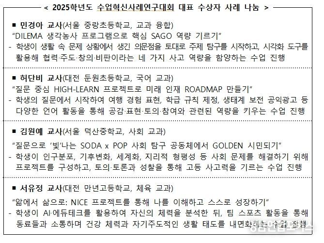 영남연합포커스 기자 | 교육부와 한국교육과정평가원(원장 직무대리 박은아)은 1월 7일, 엘타워(서울)에서 수상자와 교육청 관계자 등이 참석한 가운데 ‘2025학년도 수업혁신사례연구대회 시상식’을 개최한다.