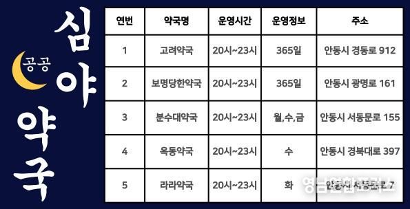 영남연합포커스 김진우 기자 | 안동시는 시민의 의약품 접근성을 높이고 심야 시간대 의료 공백을 해소하기 위해 1월 1일부터 공공심야약국을 기존 2개소에서 5개소로 확대 지정해 운영 중이다.