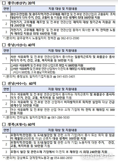 특히, 전남과 충남은 석유화학 업종 및 전·후방 연관산업의 특성을 반영하여, 지원 범위를 일용직 노동자와 화물 운수 종사자까지 확대할 계획이며, 경북의 경우 철강업 등 주력산업 업황 악화로 고충이 가중된 임금체불 노동자에 대한 긴급생계 지원책을 마련·추진해 나갈 계획이다.