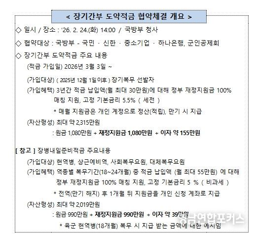 안규백 국방부장관 주관으로 2월 24일, 국방부 청사에서 국민은행, 신한은행, 중소기업은행, 하나은행, 군인공제회와 ‘장기간부 도약적금’ 업무협약을 체결하고, 협약 이행을 위해 상호 긴밀히 협력할 것을 약속했다.