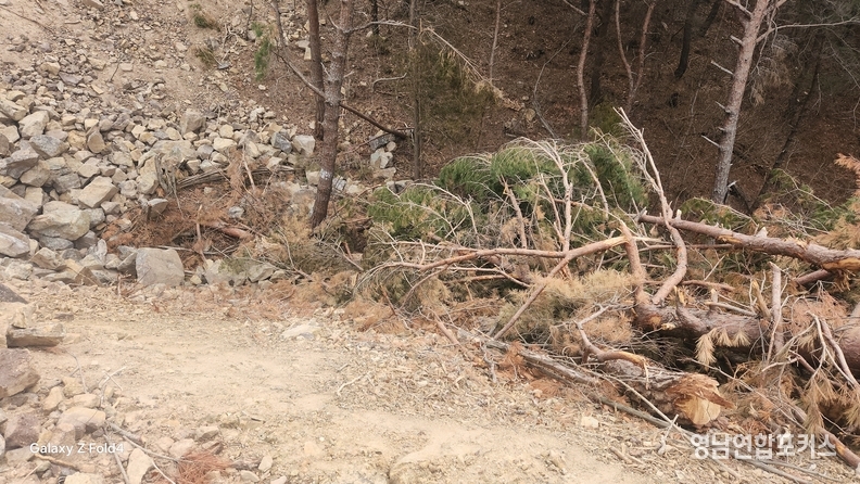 현장 확인 결과, 다수의 벌목된 소나무가 사면 아래로 무질서하게 방치돼 있었으며, 일부는 절단 후 그대로 쌓여 산사태 및 2차 사고 위험을 키우고 있는 것으로 드러났다.