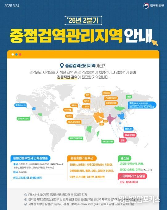 영남연합포커스 기자 | 질병관리청은 해외감염병 발생 동향과 위험평가를 바탕으로 2분기 중점검역관리지역과 검역관리지역을 지정·해제하고, 4월 1일 자로 시행한다.