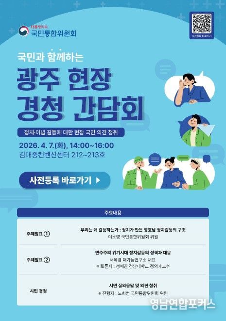 영남연합포커스 기자 | 대통령직속 국민통합위원회는 4월 7일 오후 2시부터 김대중컨벤션센터(광주 서구)에서 ‘국민과 함께하는 광주 현장 경청 간담회’를 개최한다.