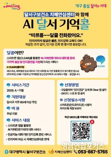 영남연합포커스 김종설 기자 | 대구 달서구는 4월부터 치매 조기발견과 예방을 동시에 지원하는 AI 기반 치매 예방 서비스 ‘AI 달서 기억콜’ 사업을 본격 추진한다.