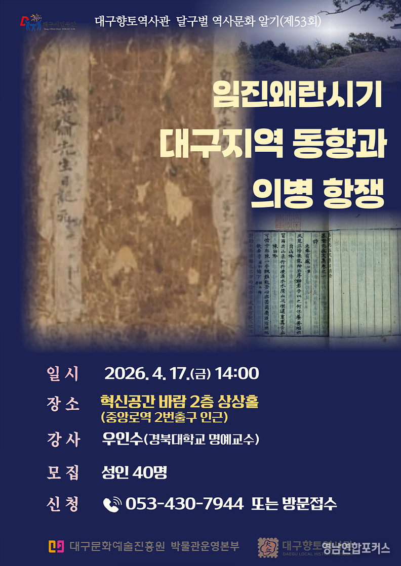 대구문화예술진흥원 박물관운영본부 소속 대구향토역사관은 2026년 대구시민주간 연계 프로그램으로 ‘임진왜란시기 대구지역 동향과 의병 항쟁’을 주제로 4월 17일(금) 2시에 전문가 특강을 개최한다.