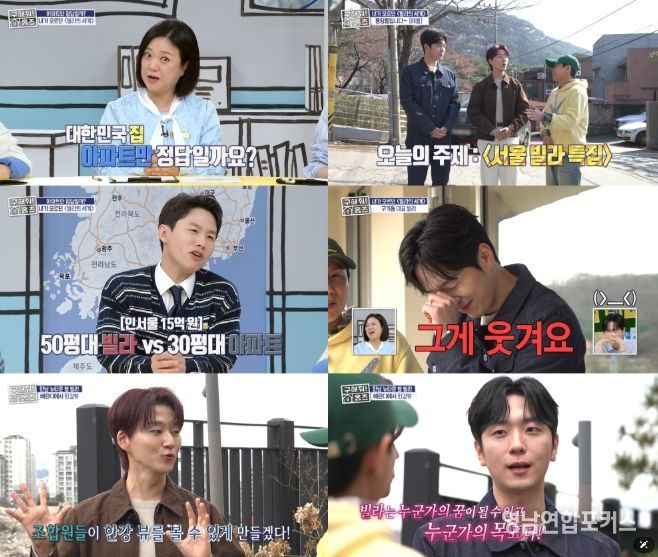 이날 방송은 서울 곳곳의 ‘빌라’를 임장하는 ‘빌라의 모든 것’ 특집으로 꾸며졌다. 한국에서 통상적으로 다세대·다가구·연립주택 등 저층 공동주택을 일컫는 ‘빌라’를 중심으로 다양한 매물들이 소개된 가운데, 4월 컴백을 앞둔 포레스텔라 조민규와 고우림이 게스트로 출연해 MC 양세형과 호흡을 맞췄다. 특히 평창동 자취 경험이 있는 부동산 관심러 조민규와 ‘홈즈’에 출연했던 임장 선배 고우림, 그리고 양세형의 케미가 색다른 재미를 더했다.