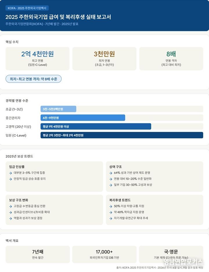 영남연합포커스 기자 | 주한외국기업연합회(상임대표 김종철, KOFA)는 ‘2025 주한외국기업백서’ 혁신판을 발표하고, 작년 6월 실시한 주한외국기업 급여 및 상여금 실태조사와 함께 복리후생 조사 결과를 포함해 공개했다. 이번 백서는 7년째 발간되는 자료로, 기존 조사 대비 한층 고도화된 분석 체계를 적용해 글로벌 전문 조사기관 수준의 HR 리포트로 업그레이드됐다는 평가를 받고 있다.