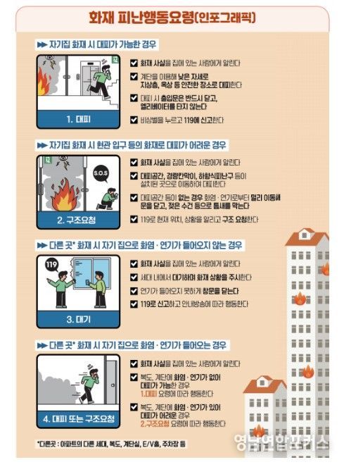 영남연합포커스 기자 | 소방청은 최근 아파트 화재가 잇따라 발생함에 따라, 인명피해를 최소화하기 위해 무리한 대피보다는 화재 상황을 먼저 판단하고 행동하는 상황별 피난 행동요령을 철저히 준수해 줄 것을 당부한다고 17일 밝혔다.