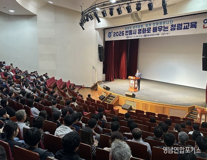 영남연합포커스 관리자 기자 | 안동시는 4월 21일 안동시민회관 낙동홀에서 시 소속 공무원 및 공직유관단체 직원 380여 명이 참석한 가운데 ‘2026년 영화로 배우는 청렴교육’을 실시했다.