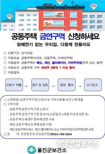 영남연합포커스 관리자 기자 | 울진군은 금연환경 조성 및 쾌적한 주거환경 조성을 위해 관내 공동주택을 대상으로‘공동주택 금연구역 지정’을 연중 신청받는다.