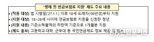 아울러 첫 보험료 지원으로 국민연금 가입자가 된 후에는 두루누리 보험료 지원, 저소득 지역가입자 보험료 지원, 실업크레딧 등 다양한 지원 제도의 혜택을 받을 수 있다.