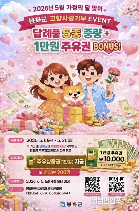 영남연합포커스 관리자 기자 | 봉화군은 5월 가정의 달을 맞이하여 고향사랑기부제 활성화를 위해 5월 1일부터 31일까지 1개월간 “답례품 UP ! 주유권 BONUS !”란 주제로 고향사랑기부제 경품 이벤트를 진행한다.