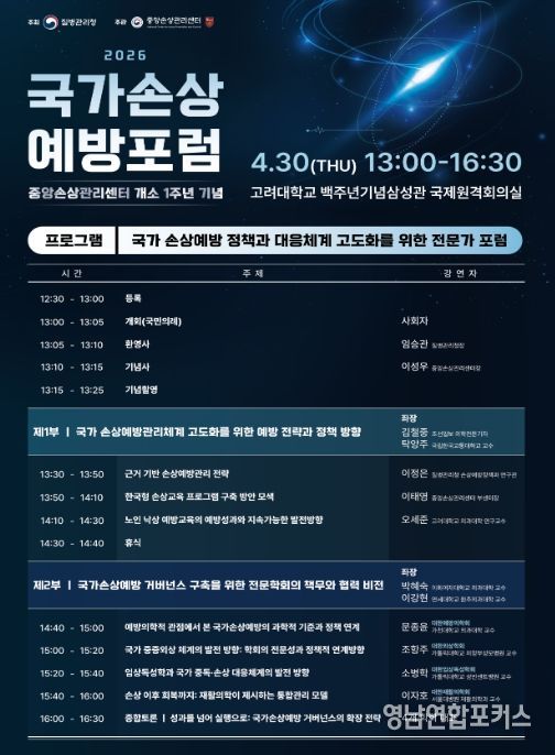 영남연합포커스 기자 | 질병관리청은 중앙손상관리센터 개소 1주년을 맞아 4월 30일 고려대학교 백주년기념삼성관에서 「2026년 국가손상예방포럼」을 개최한다.