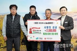 영남연합포커스 김진우 기자 | 고령군은 2월 3일 군수실에서 해담영농조합법인이 지역 내 저소득층을 위한 나눔 네트워크인 ‘함께모아 행복금고’에 성금 200만원을 기탁했다. 이번 기탁은 단순한 성금 전달을 넘어, 고령군과 농업기술센터가 추진한 ‘품종다양화 보조사업’의 성공적인 결실을 지역사회와 공유한다는 점에서 큰 의미를 지닌다. 해담영농조합법인은 그동안 고령군 농업기술센터와 협력하여 딸기 신품종 개발 및 재배 안정화 사업에 적극 참여해 왔다. 그 결과, 최근 신품종 개발에 성공하며 본격적인 출하를 통해 농가 소득이 크게 증대되는 성과를 거두었다. 이날 기탁식에 참석한 해담영농조합법인 회원들은 “고령군의 적극적인 보조사업과 기술 지원 덕분에 신품종 개발이라는 어려운 과업을 완수할 수 있었고, 이것이 실질적인 농가 소득 증대로 이어졌다.”며, “우리 농업인들이 받은 도움을 지역사회에 다시 환원하는 것은 당연한 도리이며, 회원들과 뜻을 모아 앞으로도 매년 딸기 수익금의 일부를 자발적으로 기부하기로 했다.”고 소감을 전했다. 이에 고령군은 “어려운 농업 환경 속에서도 신품종 개발이라는 값진 성